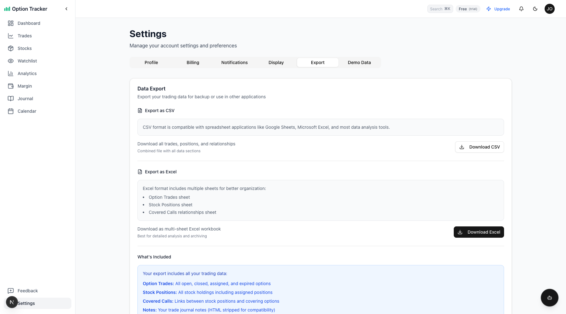 Export your complete trading data from Option Tracker in CSV or Excel format. This feature allows you to back up your data, perform external analysis, or import your trades into other tools.
