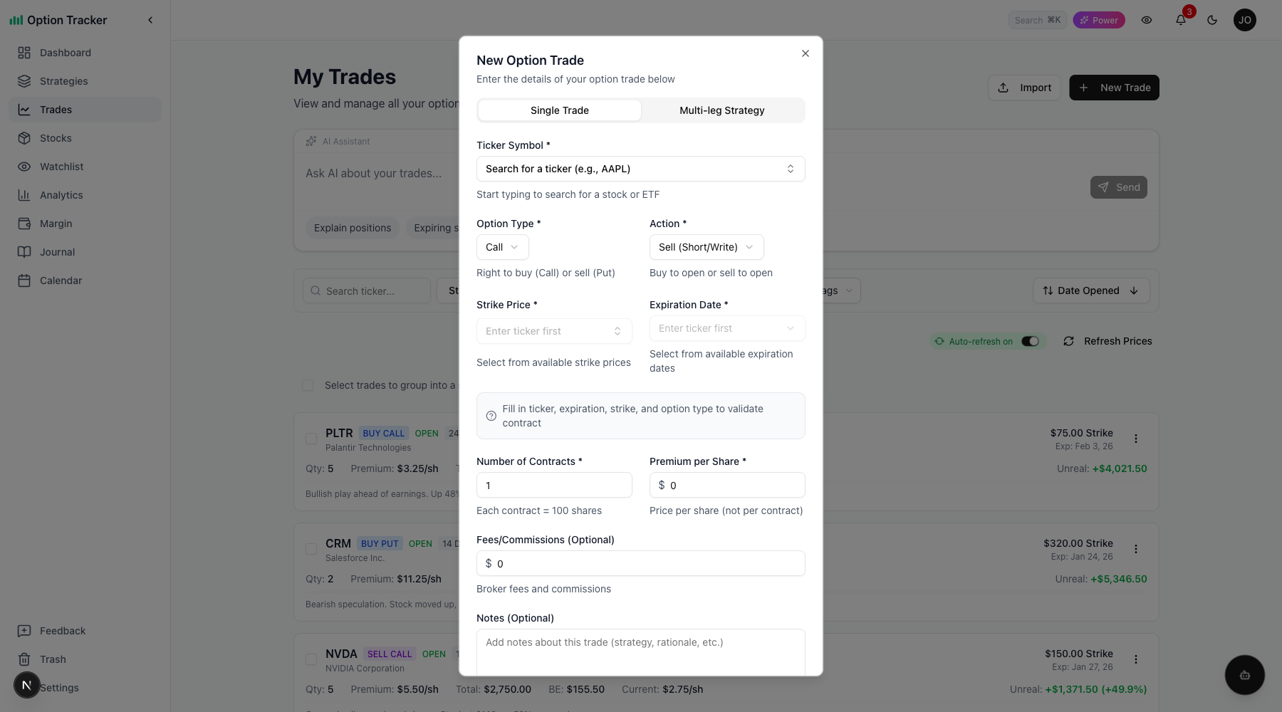 | Field | Description | |-------|-------------| | Contracts | Number of contracts (each = 100 shares) | | Premium | Price per share you paid or received | | Fees | Broker commission (optional) | | Notes | Any notes about the trade (optional) | | Tags | Labels for organization (optional) |