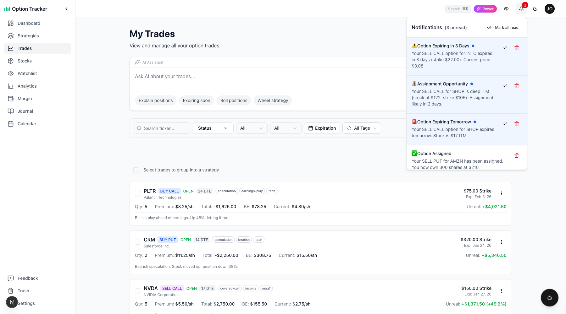 Get real-time options prices, contract matching, break-even tracking, and expiration alerts for your trades.