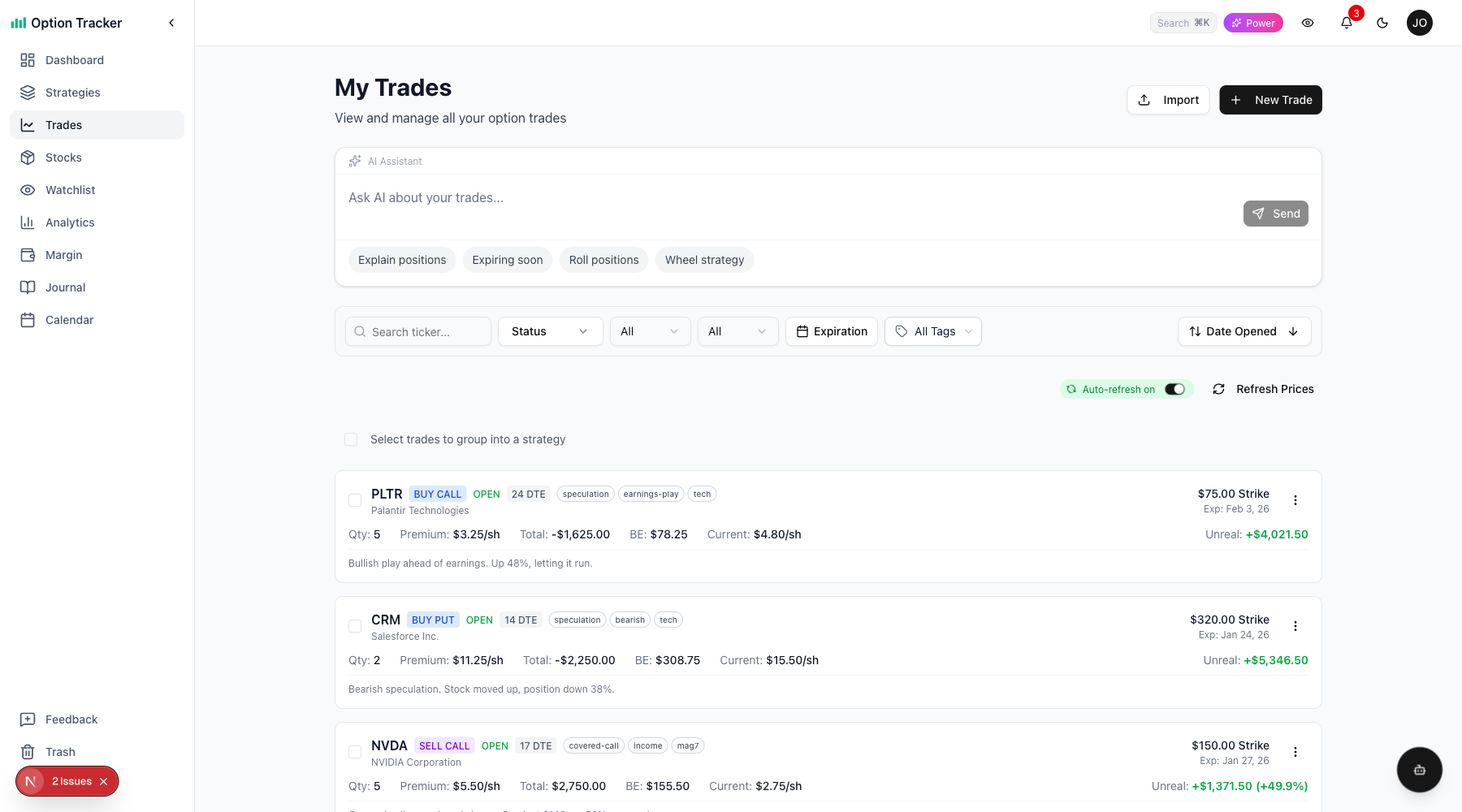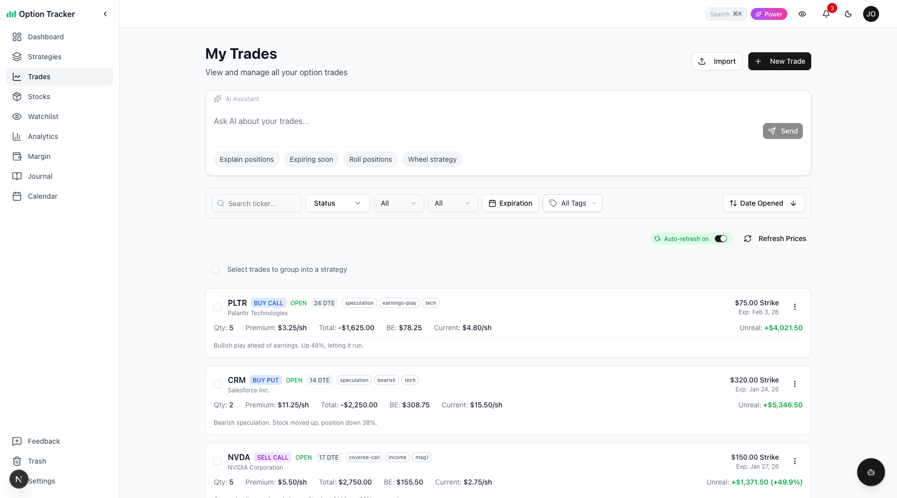 | Page | What You See | |------|--------------| | Trades | Current price, P&L, DTE, ITM/OTM badges, break-even | | Dashboard | Portfolio value with live option prices | | Strategies | Net value of multi-leg positions | | Stock Positions | Combined value including covered call premiums |