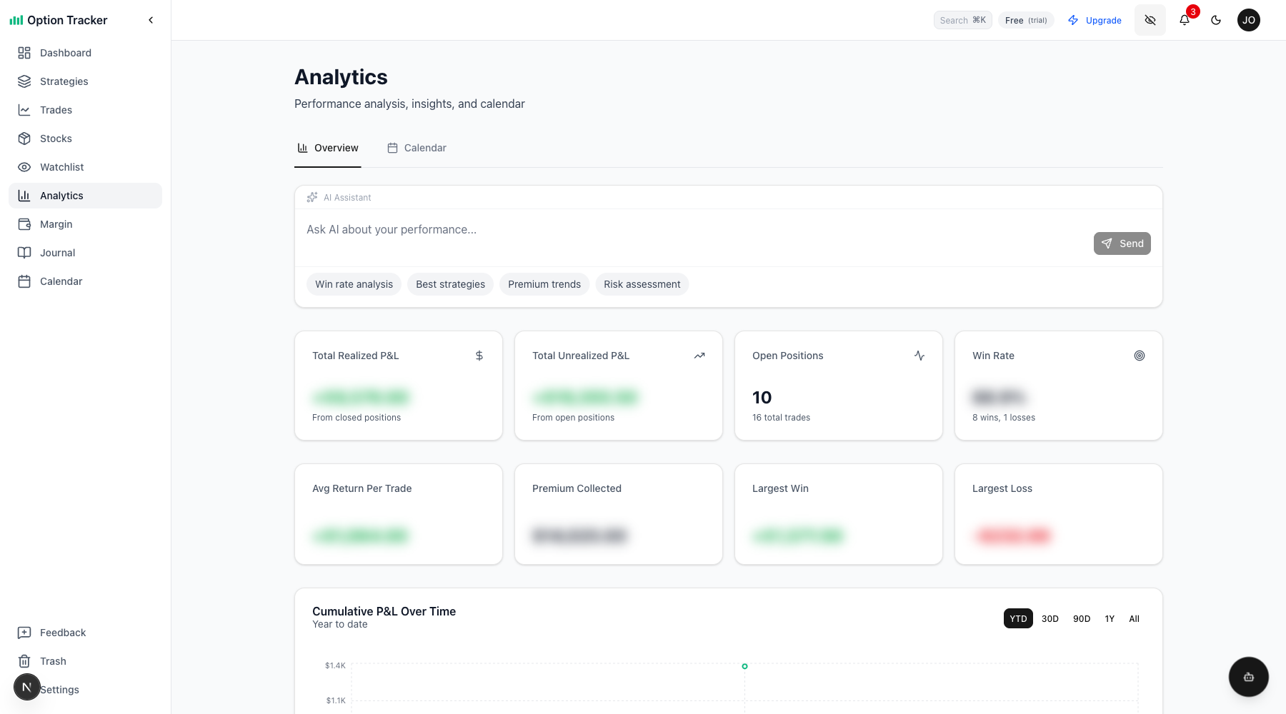 - Analytics: Average return per trade, total premium, largest win/loss, return on capital