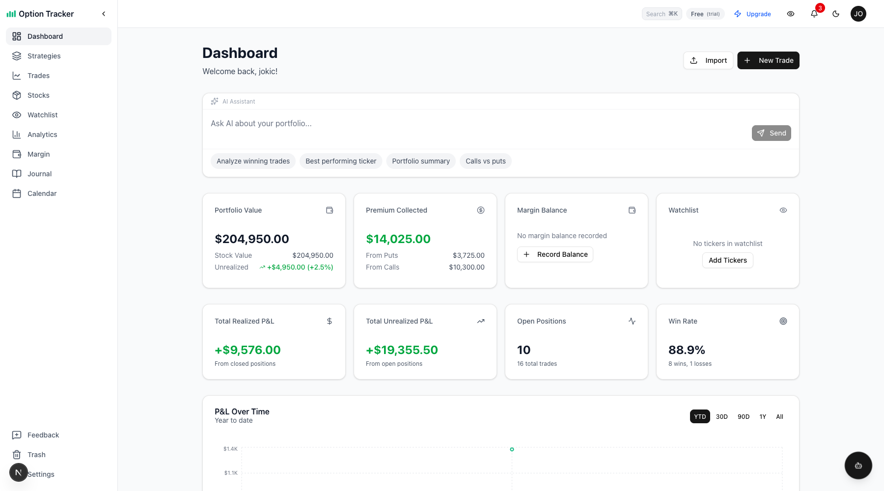 - Dashboard: Portfolio value, premium collected, margin balance, unrealized P&L