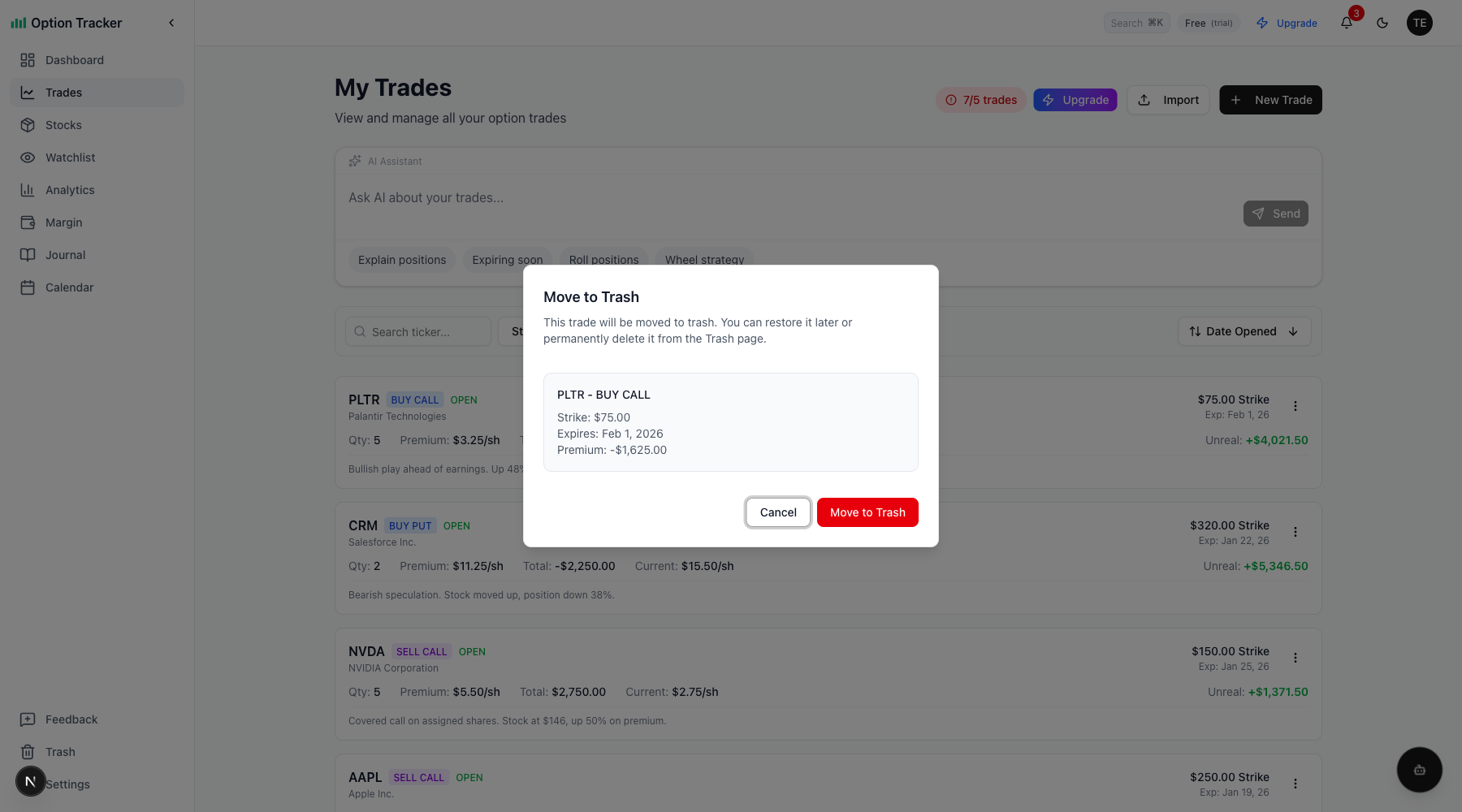When you delete a trade, you'll see a confirmation dialog before it's moved to trash: