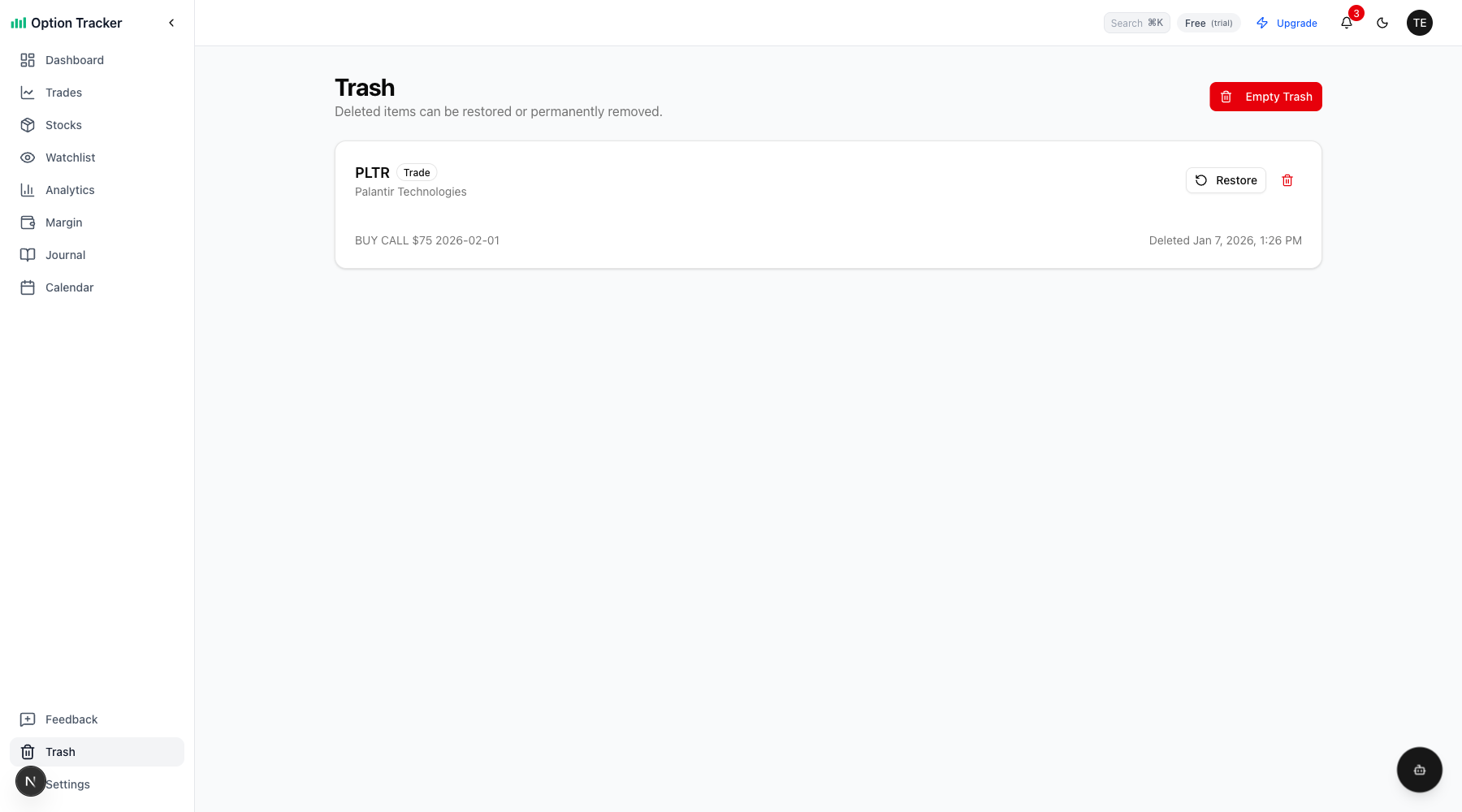 When you delete a trade or stock position, it's moved to the trash instead of being permanently deleted. This gives you a safety net to recover accidentally deleted items.