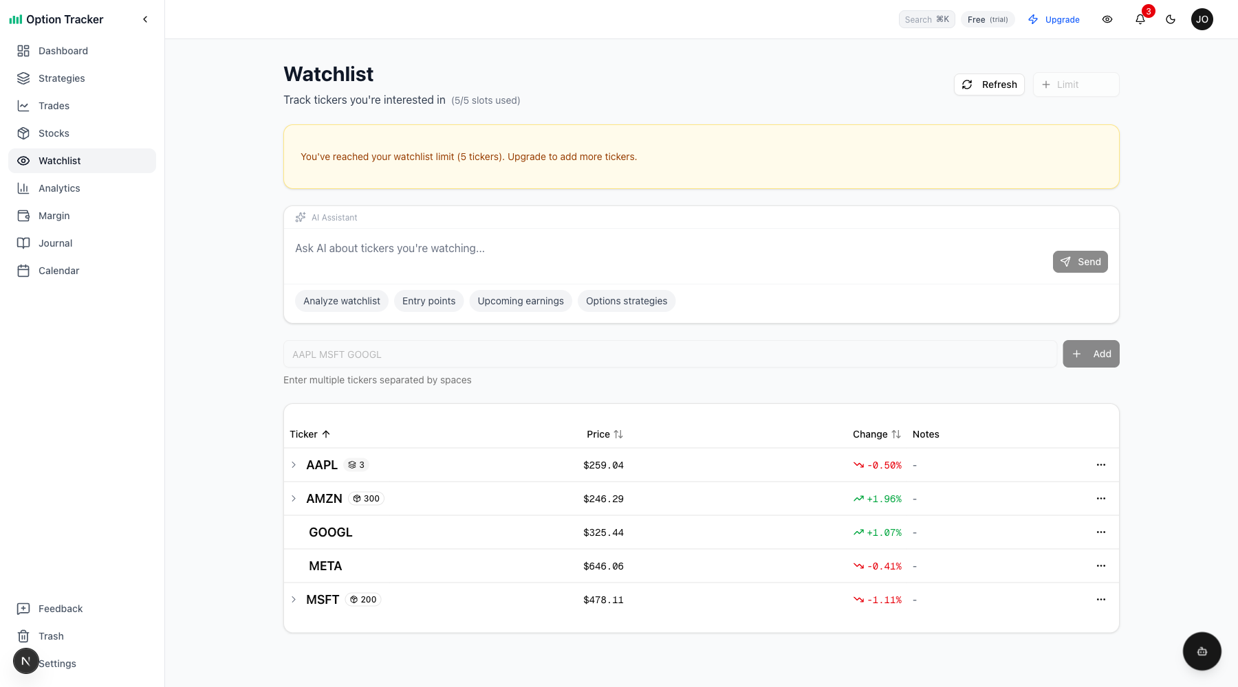 | Plan | Watchlist Slots | |------|-----------------| | Paper Trader (Free) | 5 tickers | | Active Trader | 20 tickers | | Power Trader | Unlimited |