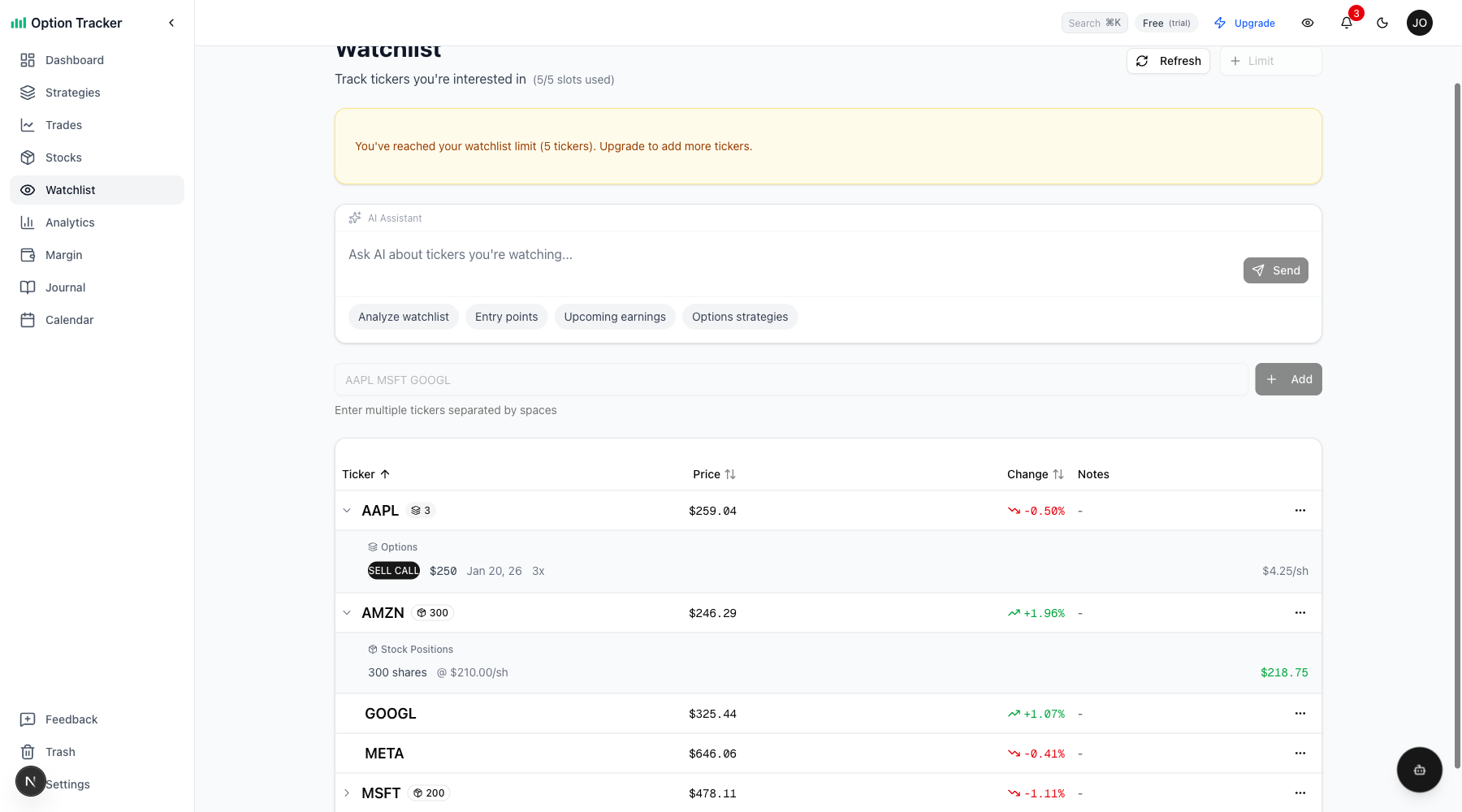 One of the most powerful features of the watchlist is seeing your active trades and stock positions alongside price data. If you have open option trades or stock positions for any watched ticker, they appear right in the watchlist.