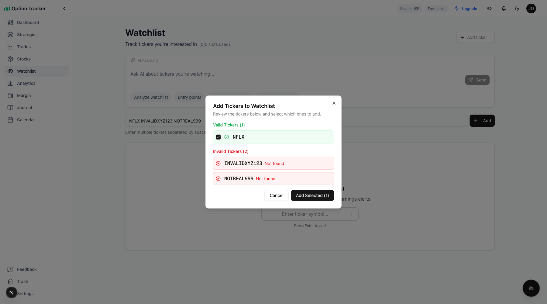 If any tickers are invalid, a confirmation dialog appears showing which tickers passed or failed validation, letting you choose which valid ones to add.